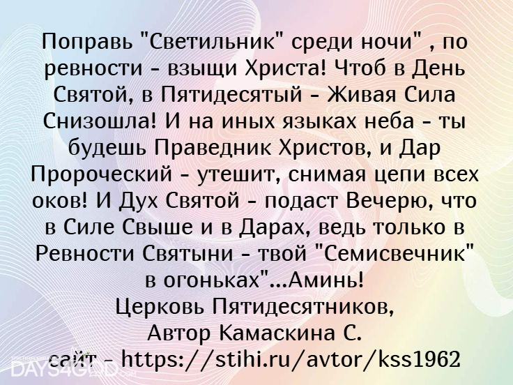 И от "Молитвенного Неба" , - Я дам вам "манну что в росе", Чтоб в воздыханиях смиренных,- Светильник ваш был в огоньке! И Дух Святой - вдвойне утешит, Вдвойне вас Силой посетит, И Ангелы Небес - восстанут, И Милость вас - Благословит!